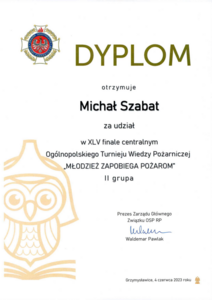 W dniach 3 - 4 czerwca 2023 r. we Wrześni Michał Szabat, uczeń klasy VIII naszej szkoły uczestniczył w finale centralnym XLV Ogólnopolskiego Turnieju Wiedzy Pożarniczej "Młodzież zapobiega pożarom". Turniej przeprowadzony został od szczebla szkolnego do ogólnopolskiego.