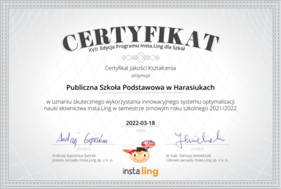Uczniowie klas IV-VIII Publicznej Szkoły Podstawowej w Harasiukach po raz kolejny zdobyli Złoty Certyfikat Jakości Kształcenia, tym razem w XVII edycji programu Insta.Ling dla szkół. Wyróżnienie to świadczy o dużym zaangażowaniu w naukę większości uczniów, ich systematycznej...