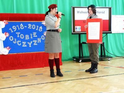 9 listopada 2018r. w naszej szkole odbyło sie podsumowanie działalności na 100-lecie Niepodległej w następującym porządku: