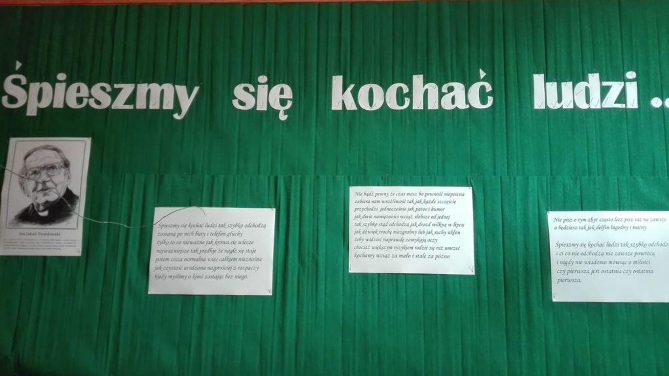 28 listopada 2019r. uczniowie klasy VIII zaprezentowali montaż poetycko-myzyczny pt. „Śpieszmy się kochać ludzi…”, który przygotowali pod kierunkiem Pani Anety Maciuk-Bogusz. Recytację tekstów współczesnych poetów: M. Pawlikowskiej-Jasnorzewskiej,