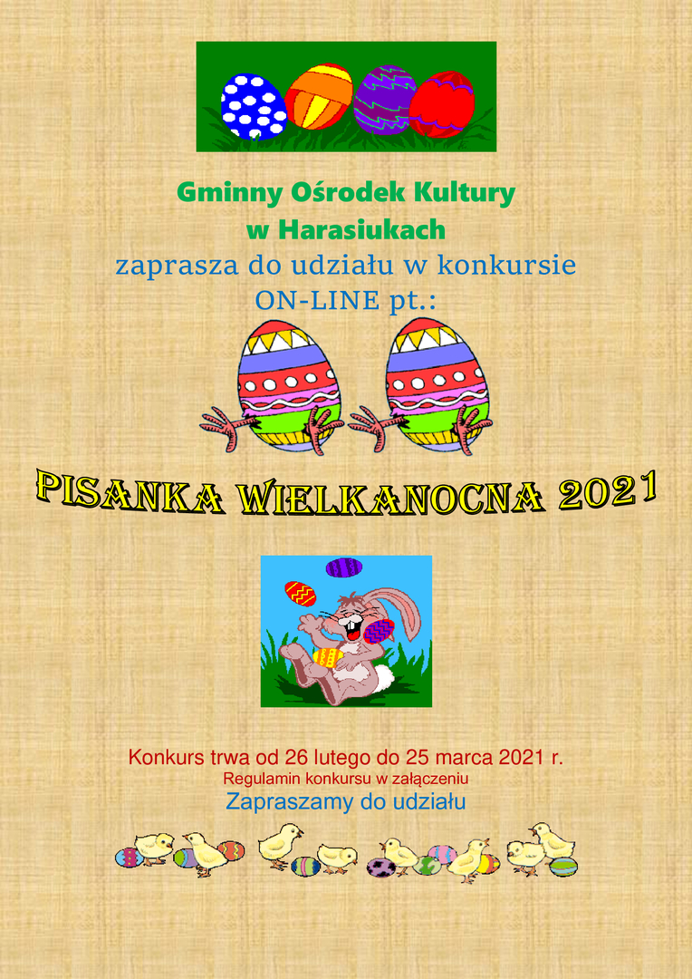 Gminny Ośrodek Kultury w Harasiukach zaprasza do udziału w konkursie on-line pt.: "Pisanka Wielkanocna 2021". W załączeniu regulamin konkursu.