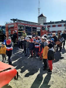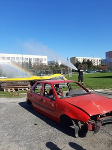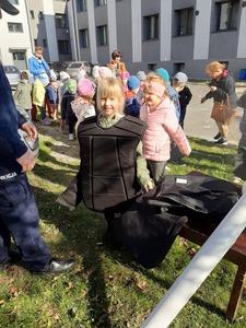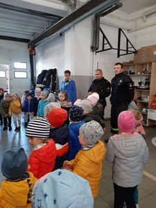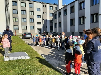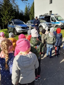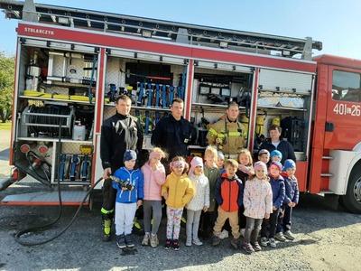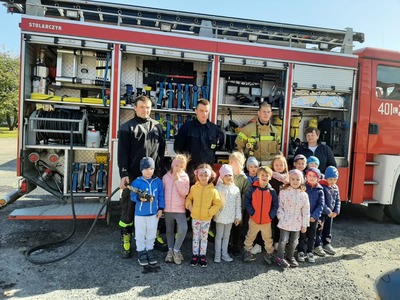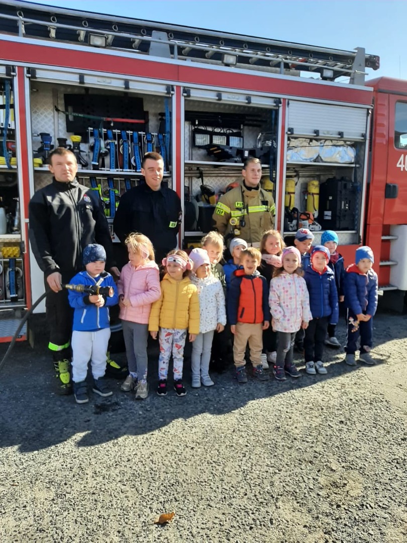 W dniu 08.10.2021r. przedszkolaki z grupy "Wiewiórki", "Żabki" i "Pszczółki" wybrały się z wizytą do Komendy Powiatowej Policji oraz Państwowej Powiatowej Straży Pożarnej w Biłgoraju. Dzieci zapoznały się z pracą policjantów i strażaków oraz przypomniały sobie zasady bezpiecznego zachowania na drodze oraz w przypadku zagrożeń tj. pożaru czy burzy. Miały też okazję zobaczyć umiejętności psa policyjnego co wywołało wiele emocji. Z dużym zainteresowaniem oglądały i przymierzały sprzęt i ubiór policyjny. Każdy mógł usiąść w radiowozie policyjnym i poczuć się jak prawdziwy policjant. Natomiast Panowie Strażacy zademonstrowali dzieciom niebywałą sprawność zjeżdżania po rurze i przebierania się w strój bojowy. Przedszkolaki mogły obejrzeć z bliska samochody strażackie z ich pełnym wyposażeniem. Dużo emocji wzbudził prezentowany sprzęt            do rozcinania samochodów oraz pokaz gaszenia wodą ognia, gdzie przy słonecznej aurze powstała przepiękna tęcza. Wycieczka była bardzo atrakcyjna, wywołała u dzieci wiele wrażeń i radości.