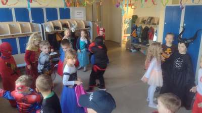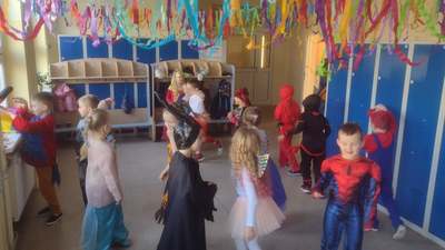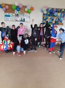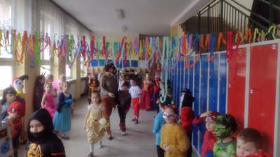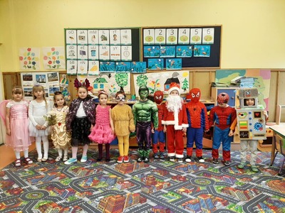 Tego dnia  już od rana w przedszkolu i szkole pojawiały się kolorowe postacie. Dzieci przebrane były za  bohaterów znanych bajek, w salach przedszkolnych można było spotkać wróżki, królewny, księżniczki,  motylki, rycerzy, piratów,policjantów, Spider-Mana, Batmana, ...  nie sposób zliczyć i wymienić tych wszystkich  postaci. Wystrój sali wprowadził w radosny nastrój oraz zachęcał wszystkich do wesołej zabawy.