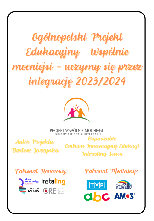 Uczniowie klasy V przystąpili właśnie do Ogólnopolskiego projektu edukacyjnego "Wspólnie mocniejsi - uczymy się przez integrację! ". Projekt ma na celu rozwijanie różnorodnych umiejętności oraz wzmacnianiu więzi między uczniami. Integrowanie grupy klasowej, rozwijanie kreatywności oraz uczenie wrażliwości są również promowane w projekcie. Będzie realizowany na lekcjach wychowawczych do końca roku szkolnego.
