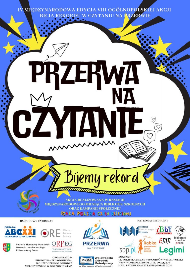 do IV Międzynarodowej Edycji VIII Ogólnopolskiej Akcji „Przerwa na czytanie-bicie rekordu w czytaniu na przerwie”. Akcja realizowana jest w ramach Międzynarodowego Miesiąca Bibliotek Szkolnych oraz kampanii społecznej „Cała Polska czyta dzieciom”.