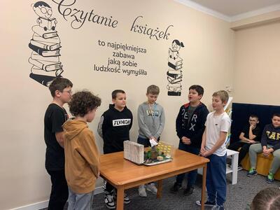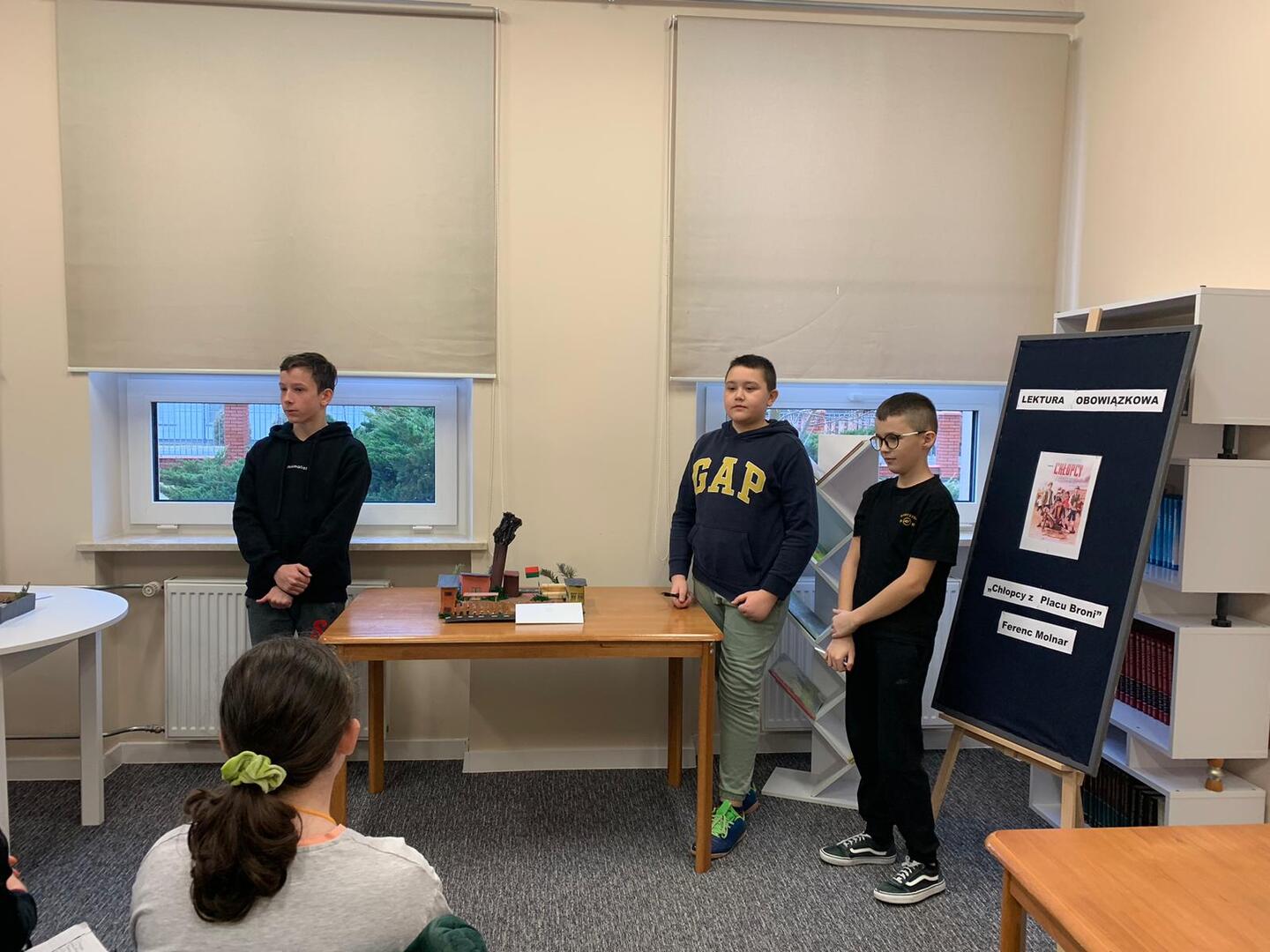 25 stycznia w szkolnej czytelni odbyło się spotkanie zorganizowane w ramach realizowanej na lekcjach języka polskiego innowacji ,,Znam lektury szkolne”. Podczas spotkania uczniowie klasy V prezentowali przygotowane przez nich makiety placu zabaw przygotowane w grupach w ramach podsumowania omawianej lektury Ferenca Molnara pt. ,,Chłopcy z Placu Broni” Zaproszeni na spotkanie uczniowie klasy IV wysłuchali wypowiedzi o lekturze i jej bohaterach oraz obejrzeli makiety.