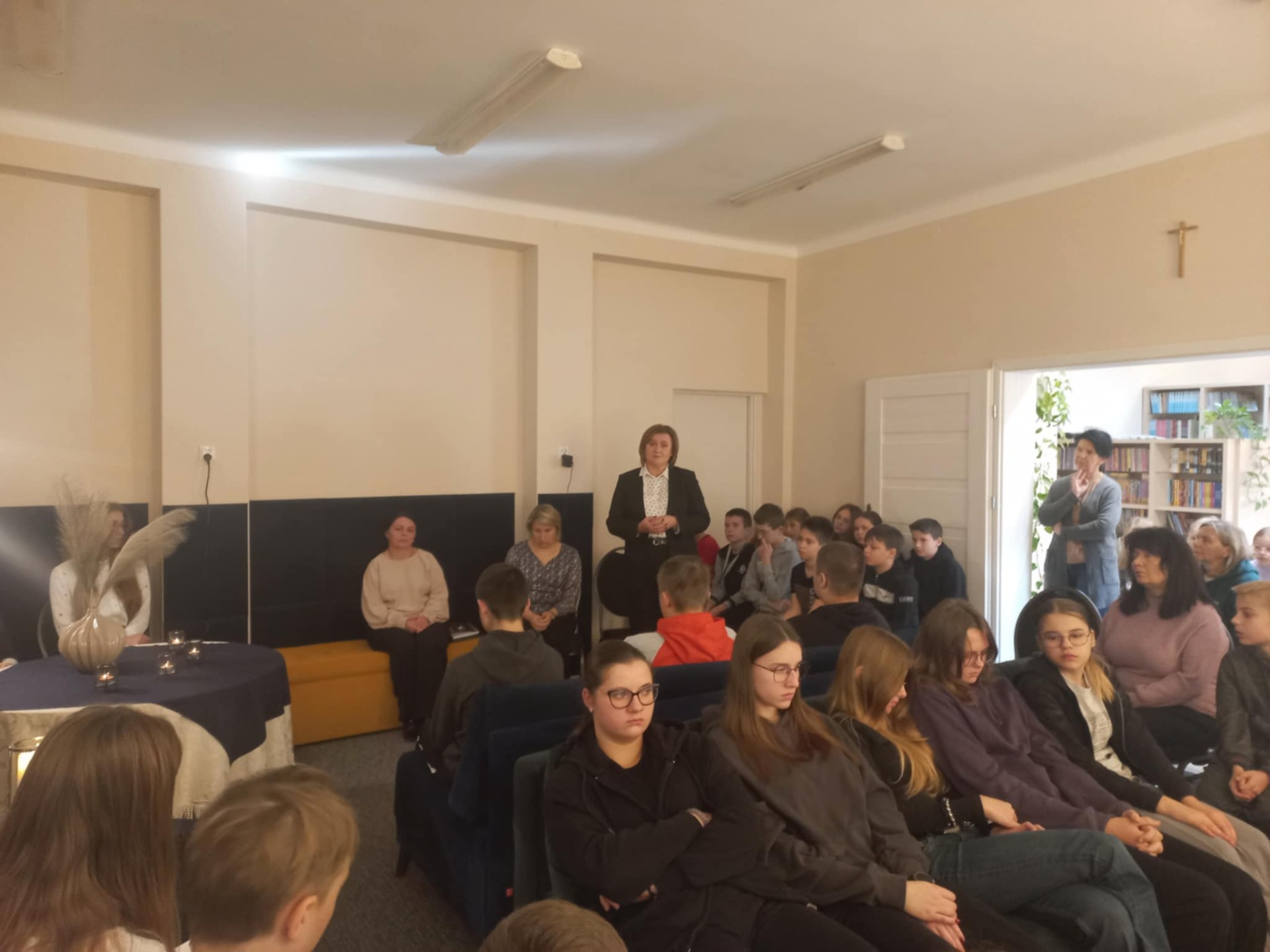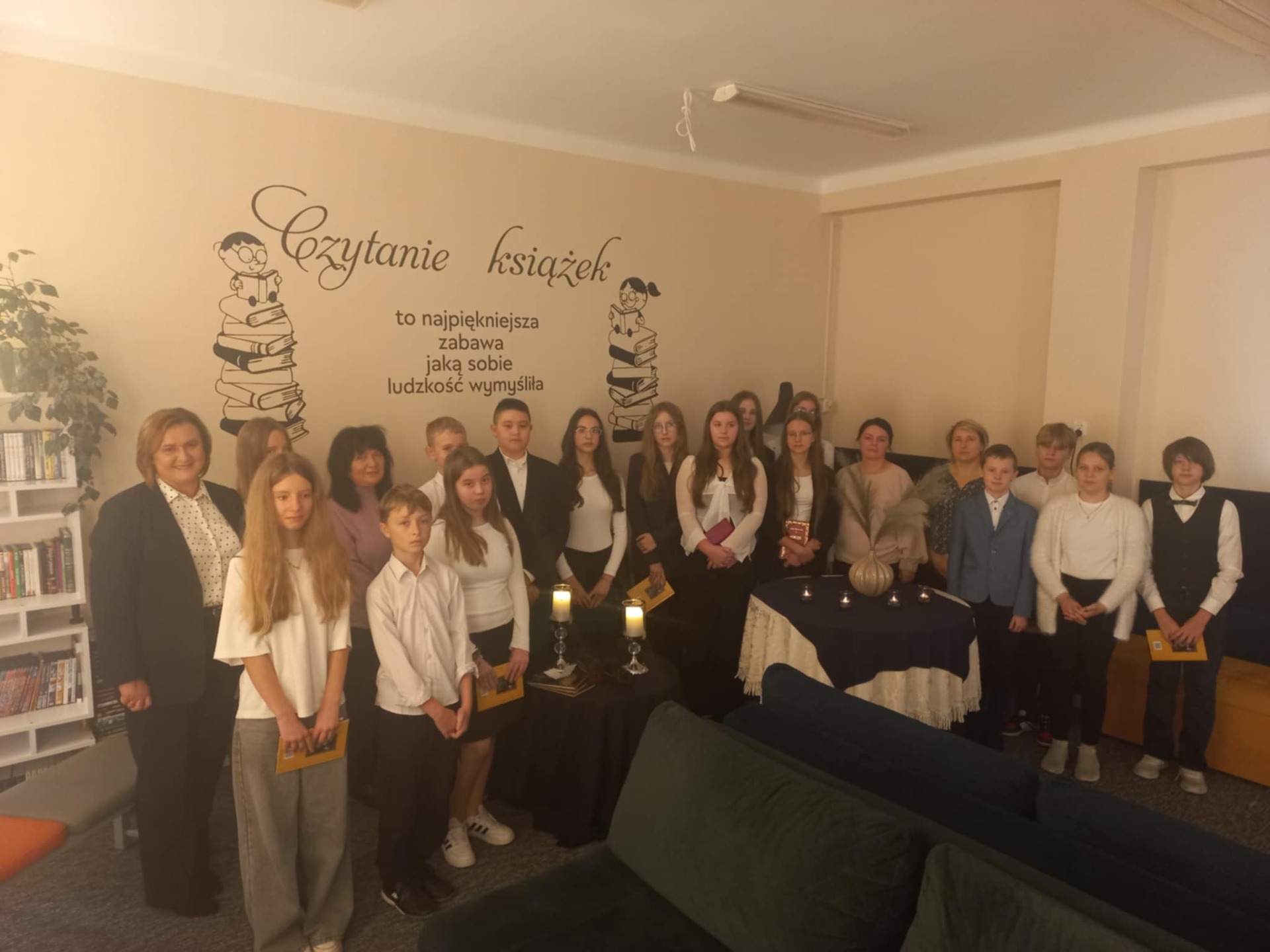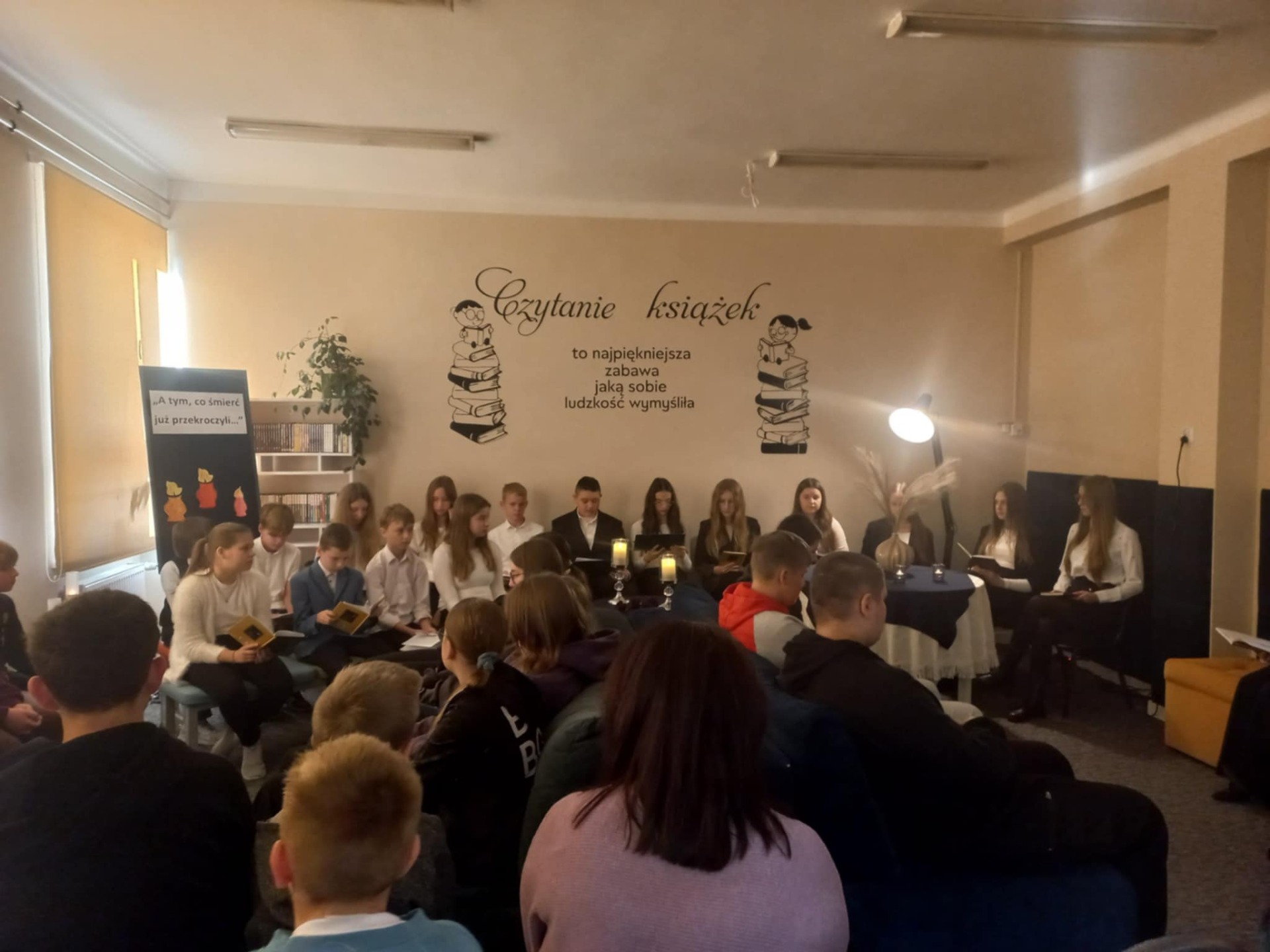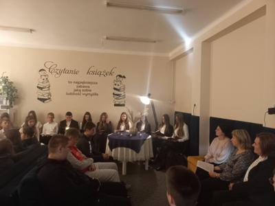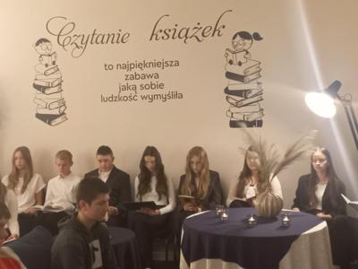 W „Wieczorze z książką” wzięli udział uczniowie klas: IV, VI, VII, VIII, nauczyciele i pani dyrektor. Wszyscy zgromadzeni mieli okazję wysłuchać fragmentów poezji różnych autorów ukazujących tematy śmierci, jako doświadczenia wpisanego w ludzkie życie. Wśród czytających znaleźli się uczniowie należący do „Klubu czytelnika” ora chętni uczniowie z klas V-VIII.